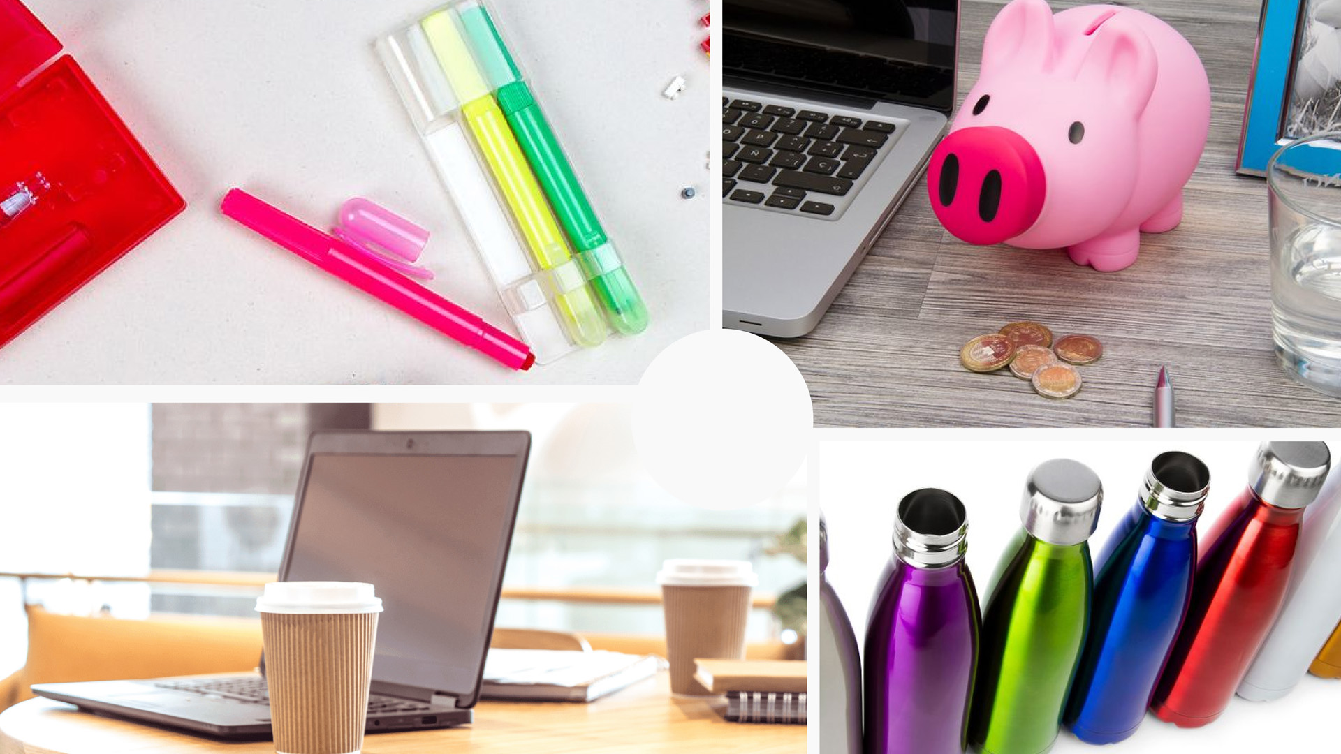 Artículos de oficina, que van desde libretas, carpetas, agendas, calculadoras, y otros obsequios promocionales originales a un precio económico